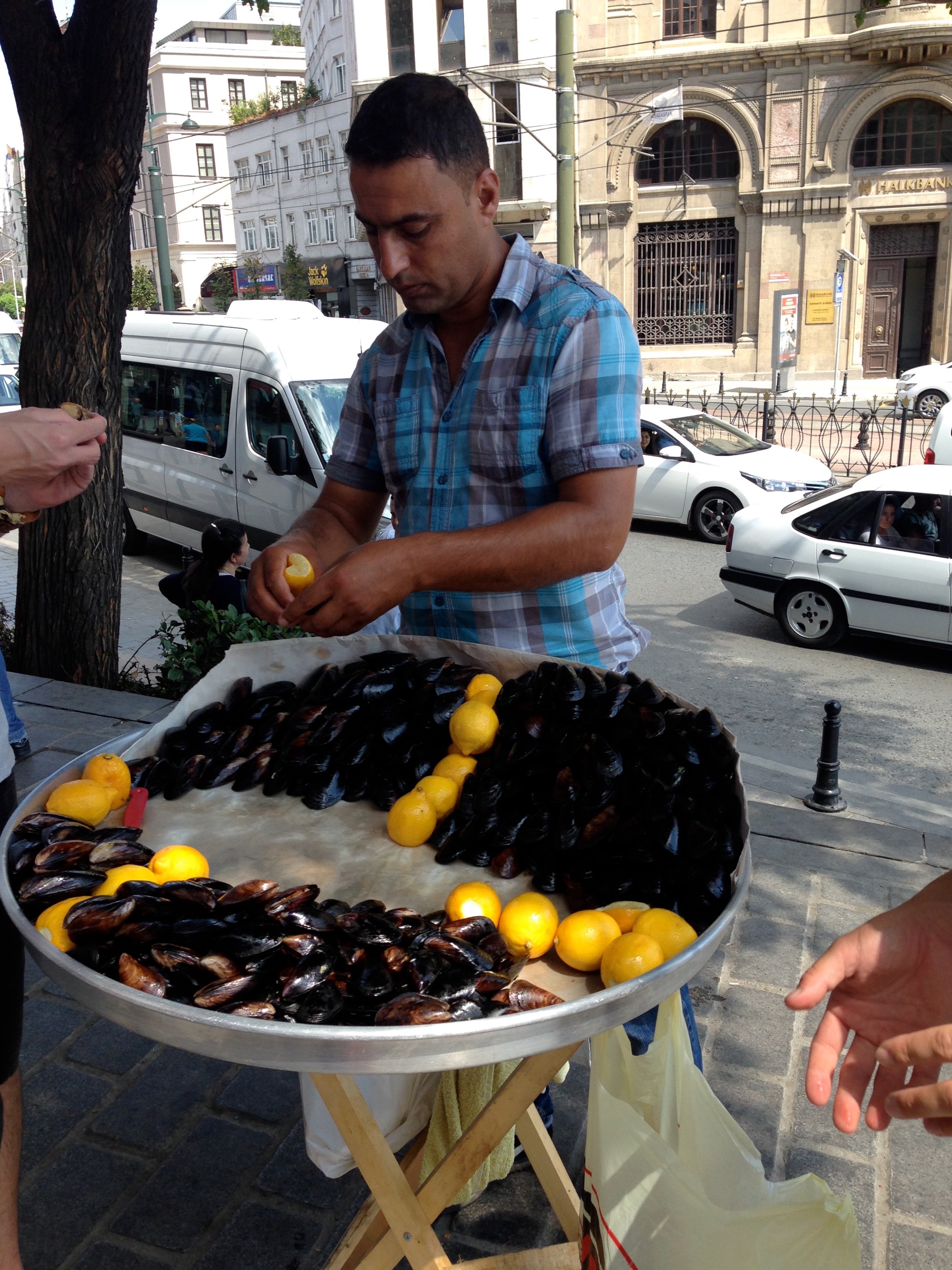 Kurz nach Giacomos Ankunft zeigte sich die Sonne wieder und wir fuhren gemeinsam zum asiatischen Teil von Istanbul. Auf dem Weg zur Fähre kosteten wir die mit Reis gefüllten Muscheln, die an kleinen Ständen zahlreich verkauft werden. Köstlich.