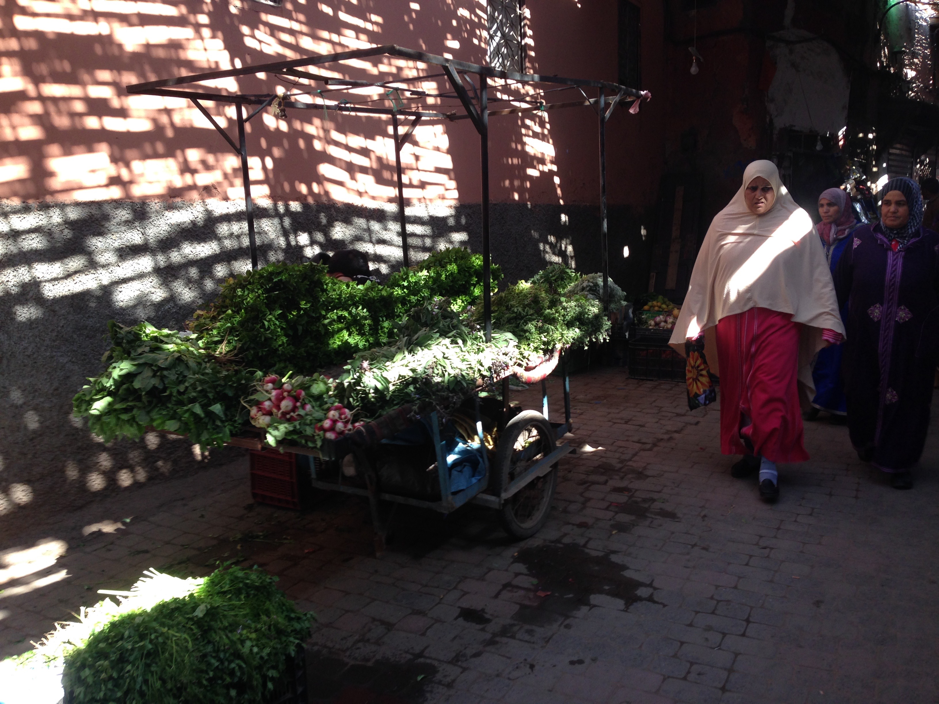 Durch die vielen Suks, die oftmals mit Palmwedeln überdachten Marktstraßen einer Medina, wirkt die gesamte Altstadt wie ein Markt für Lederwaren, Gewürze, Kräuter, Töpferwaren, Obst und Gemüse. Wir kauften für ein paar Dirham Ledersandalen (für sie), einen Ledergürtel (für ihn) und kleine Geschenke (für die Familie Zuhause).