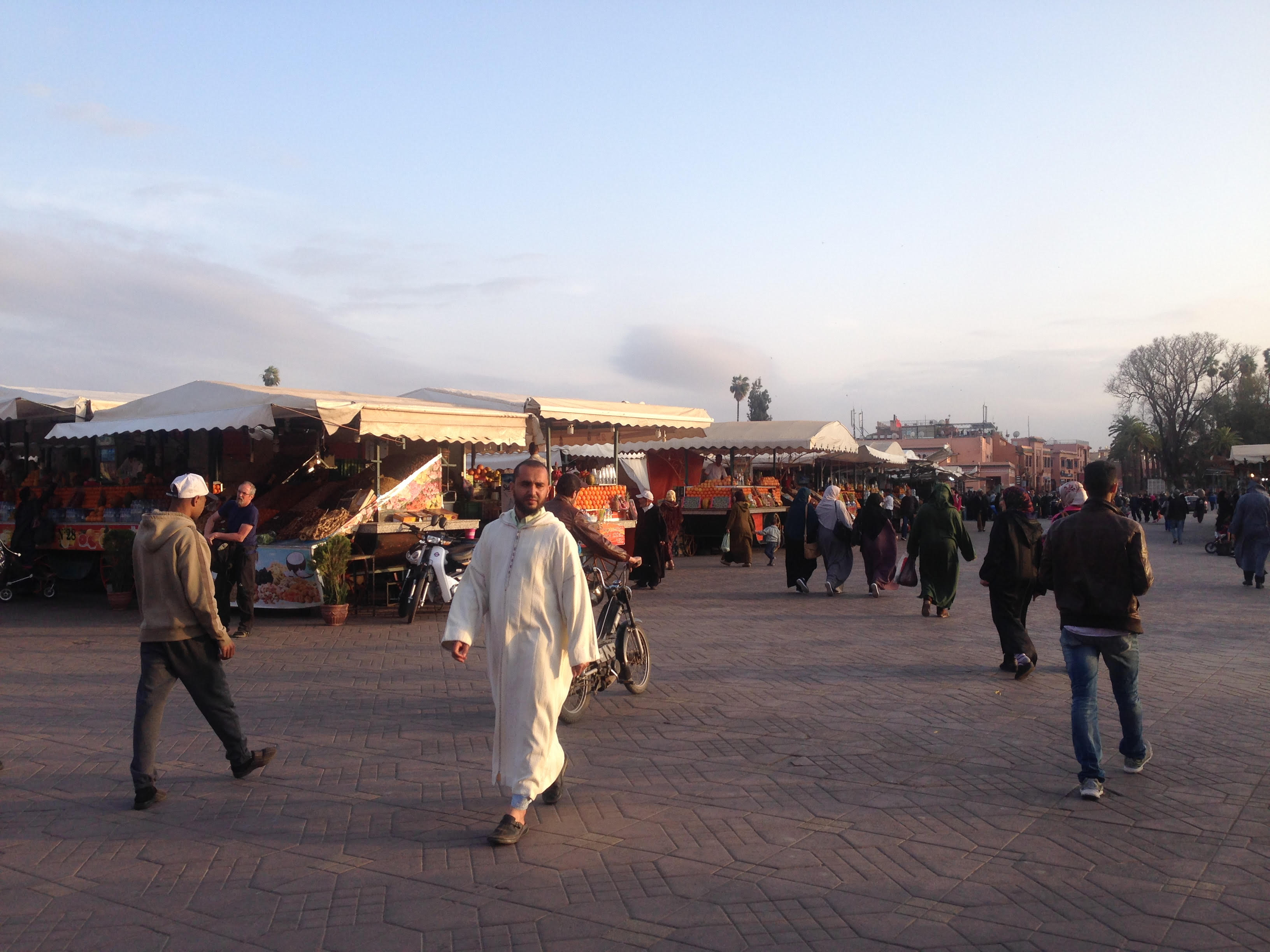 Wir gingen zum Platz „Djemaa el Fna“, testeten alle auf dem Weg liegenden Geldautomaten und bekamen schließlich direkt am Platz noch etwas Geld. Benommen von dem Gewimmel aus Menschen, Schlangen, dressierten Affen und nordafrikanischen Gauklern, aßen wir entgegen aller Ratschläge doch an einer der Buden, die vor allem Gegrilltes im Angebot haben. Wir hätten es sein lassen sollen… Brot & Oliven (sonst ein kostenloser Gruß aus der Küche) fanden sich teuer auf der Rechnung wieder und unsere Unterhaltung über diesen „Trick“ wurde mit größter Unfreundlichkeit quittiert.