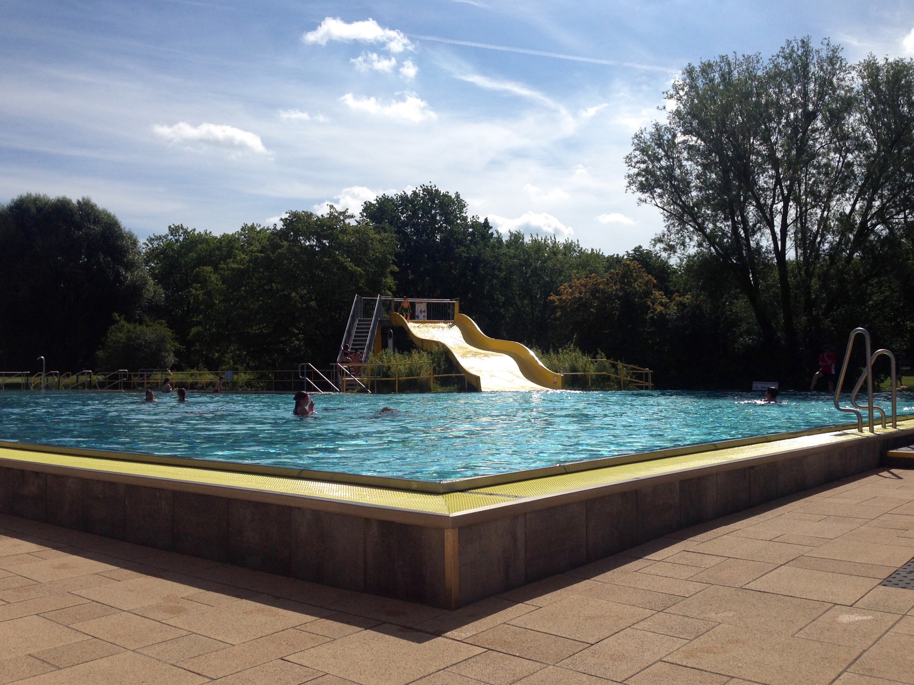 Im Hintergrund wacht massiv das Gropiushaus über die Gäste im Freibad.