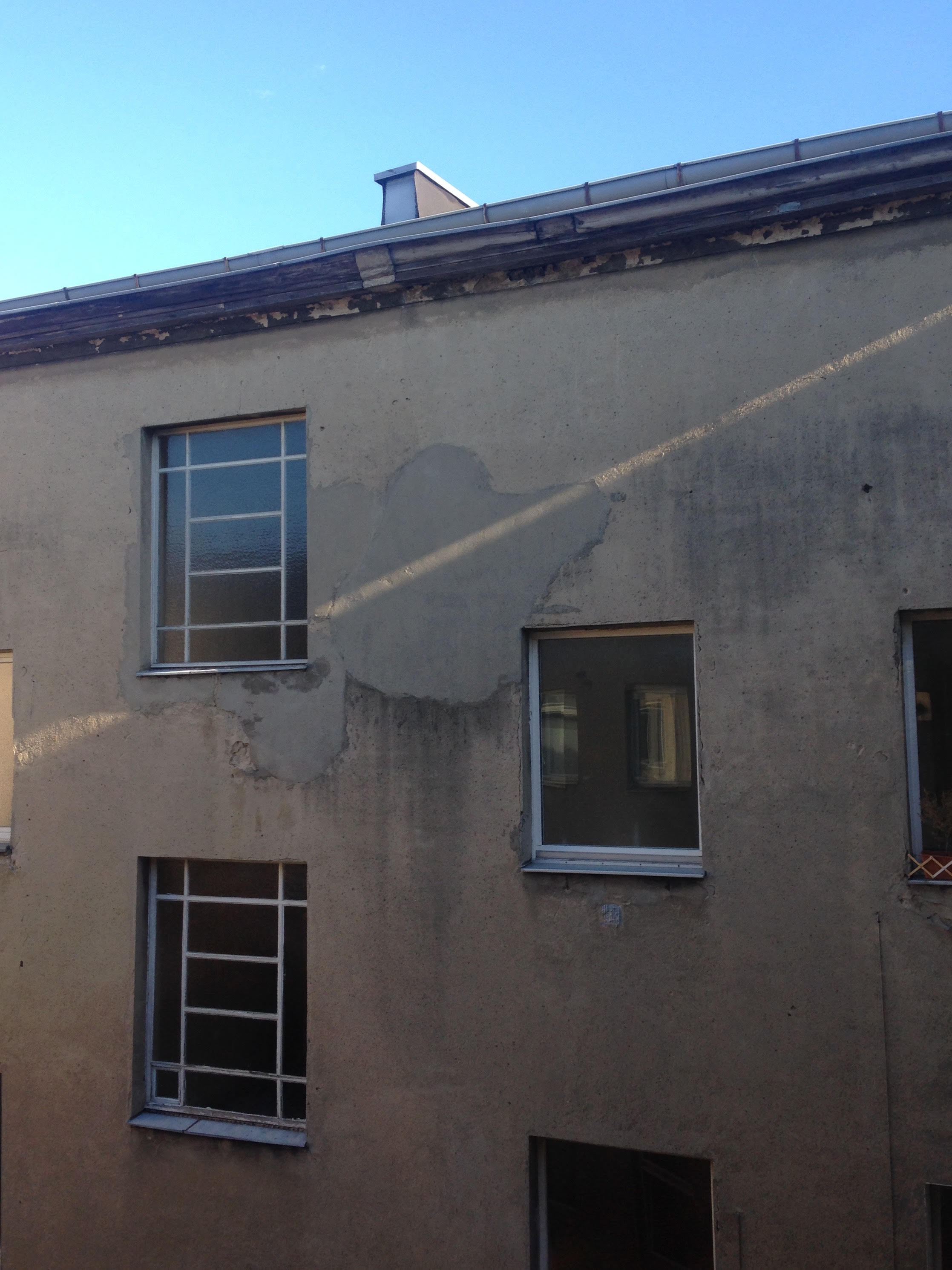Blick aus dem Küchenfenster in den Innenhof. Könnt ihr den Hundekopf an der Hausfassade erkennen? Inzwischen musste er einer Fassadensanierung weichen.