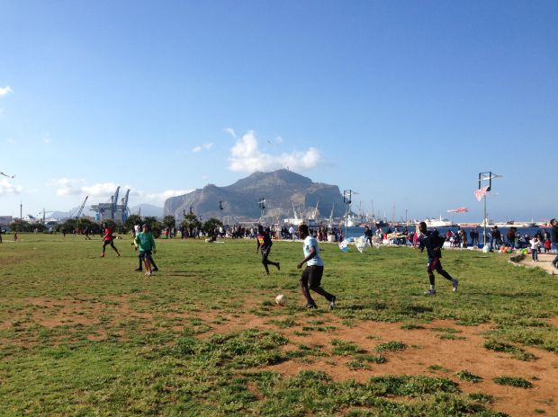 Streetlife hat man in Palermo auf allen Straßen und in den kleinen Gassen. Besonders beliebt war am Ostersonntag das Foro Italico. Das ist eine große Wiese mit ein paar Palmen direkt am Meer. Da der vorhergesagte Regen ausblieb, machten wir uns am frühen Nachmittage auf den Weg dorthin. Am späteren Nachmittag war die Grünanlage voll. Viele Kinder und junge Männer spielten Fußball, Pärchen lagen engumschlungen auf der Wiese, Hunde rannten an uns vorbei, Kinder mit Ballons und Lenkdrachen rannten über die Wiese, Ältere saßen auf den Bänken am Meer, es wurden Limo, Bier und Zuckerwatte verkauft und die indische Community bestimmte mit Generatoren den Sound zum Geschehen. Wir saßen auf der Wiese und fühlten uns inmitten des bunten Treibens schon fast zugehörig.