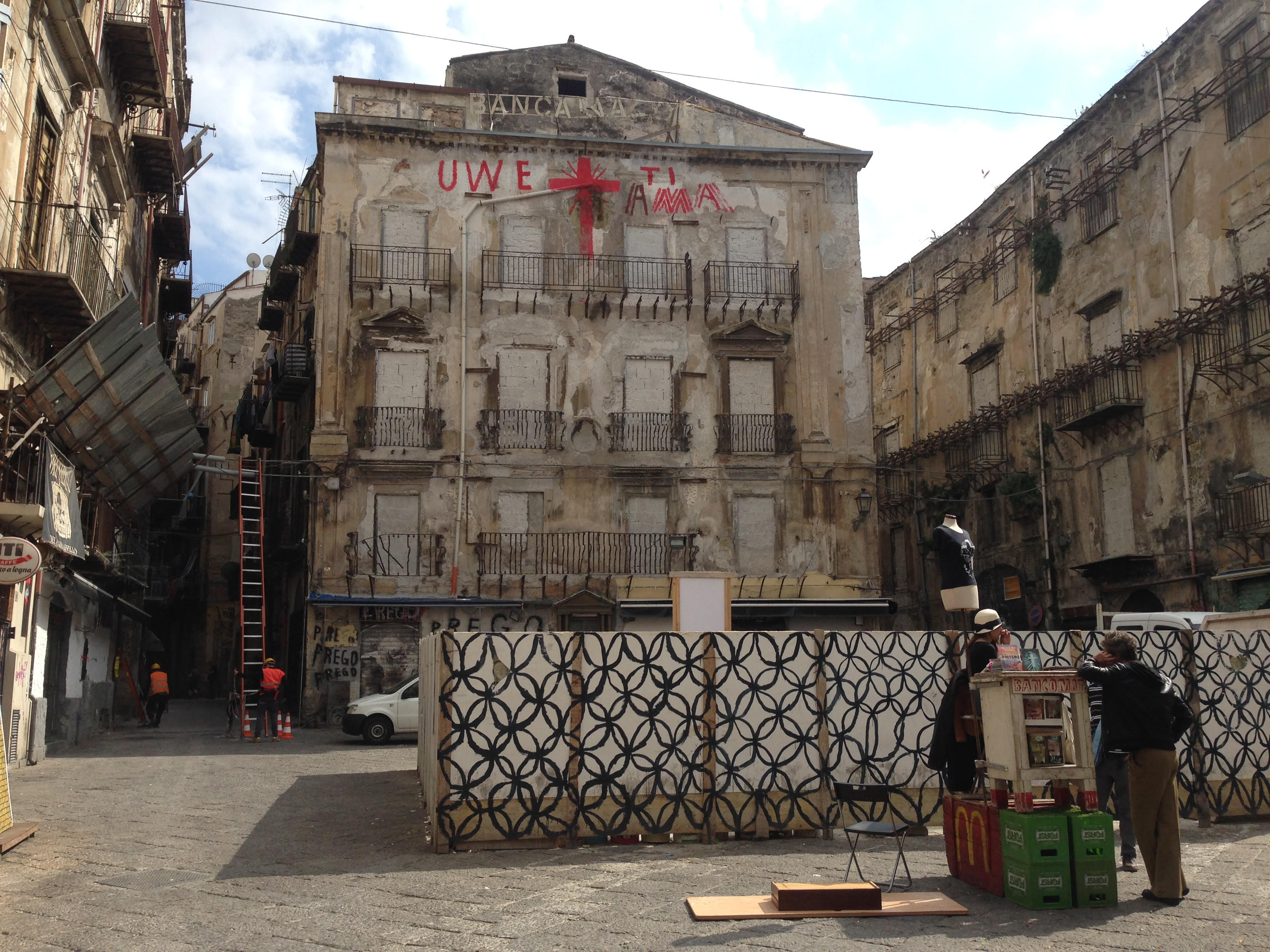 Beim Bummel durch La Loggia fanden wir uns plötzlich auf einem Platz wieder, dessen Gebäude rundherum bemalt waren oder Botschaften wie „Uwe ti ama“ verkündeten. In der Mitte des Platzes befand sich ein abgesperrter Brunnen. Davor saß eine Frau hinter einem selbstgebauten Bancomat, neben ihr ein Mann mit weiten Schlaghosen. Wir erkannten nicht sofort, dass wir auf der Via Garraffello direkt vor dem Brunnen „Fontana del Garraffello“ standen und der Mann der österreichische Künstler Uwe Jäntsch und die Frau seine Lebensgefährtin Constanza Lanza di Scalea waren. Aus Protest gegen den Verfall des einst prunkvollen Viertels mit seinen prächtigen Bauten und Palazzi war es eine Aktion von mehreren, in denen Uwe Jäntsch auf den historischen Brunnen an der Via Garraffello „si vende“ (dt.: zu verkaufen) sprühte. „Uwe ti ama“ (dt.: Uwe liebt dich) prangt auf der Banca Nazion und der selbstgebaute Bancomat weist mahnend auf die Digitalisierung von Geschäften und die Gentrifzierung von Palermos Altstadt hin.
