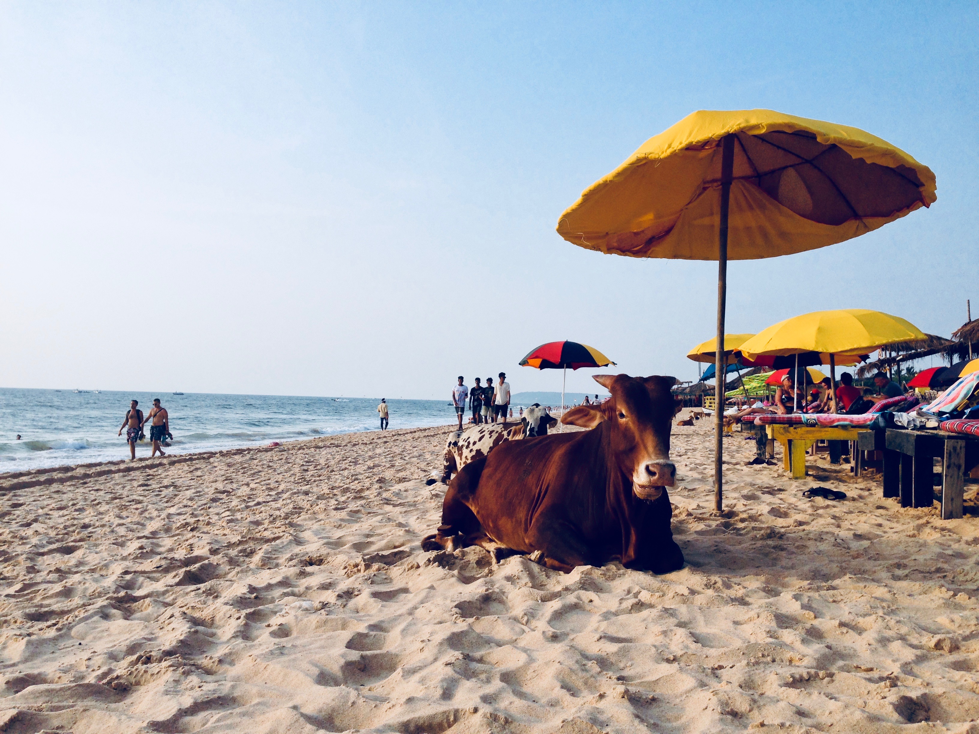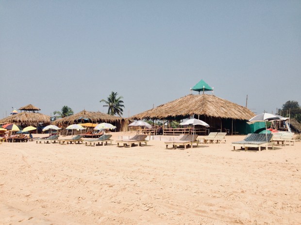 Der Weg zum Meer ist vielfach mit kleinen Buden gesäumt, die Tücher, Kunsthandwerk, Gewürze oder billigen Touristenkram verkaufen. Das Arabische Meer hat im Oktober für mich eine sehr angenehme Wassertemperatur zwischen 25 und 28 Grad. An den langen Sandstränden haben wir gemeinsam mit den Kühen stundenlange Spaziergänge gemacht und im Schatten eines Sonnenschirms gelesen und geschlafen. Der Strand ist gesäumt von Strandhütten „Shacks“, die Getränke und Essen verkaufen und Strandbetten mit Sonnenschirmen bereitstellen. Einige Shacks verfügen über eine gute und meistens preisgünstige Speisekarte. In der Nebensaison (Oktober/November, Februar/März) haben nicht alle Shacks geöffnet. Dennoch ist es absolut kein Problem, einen schönen Platz zu finden. Bei dem großen Angebot waren manche Shacks komplett leer. Ich mochte mir nicht vorstellen, wie voll es dort werden kann, wenn in der Hauptsaison alles belegt ist.