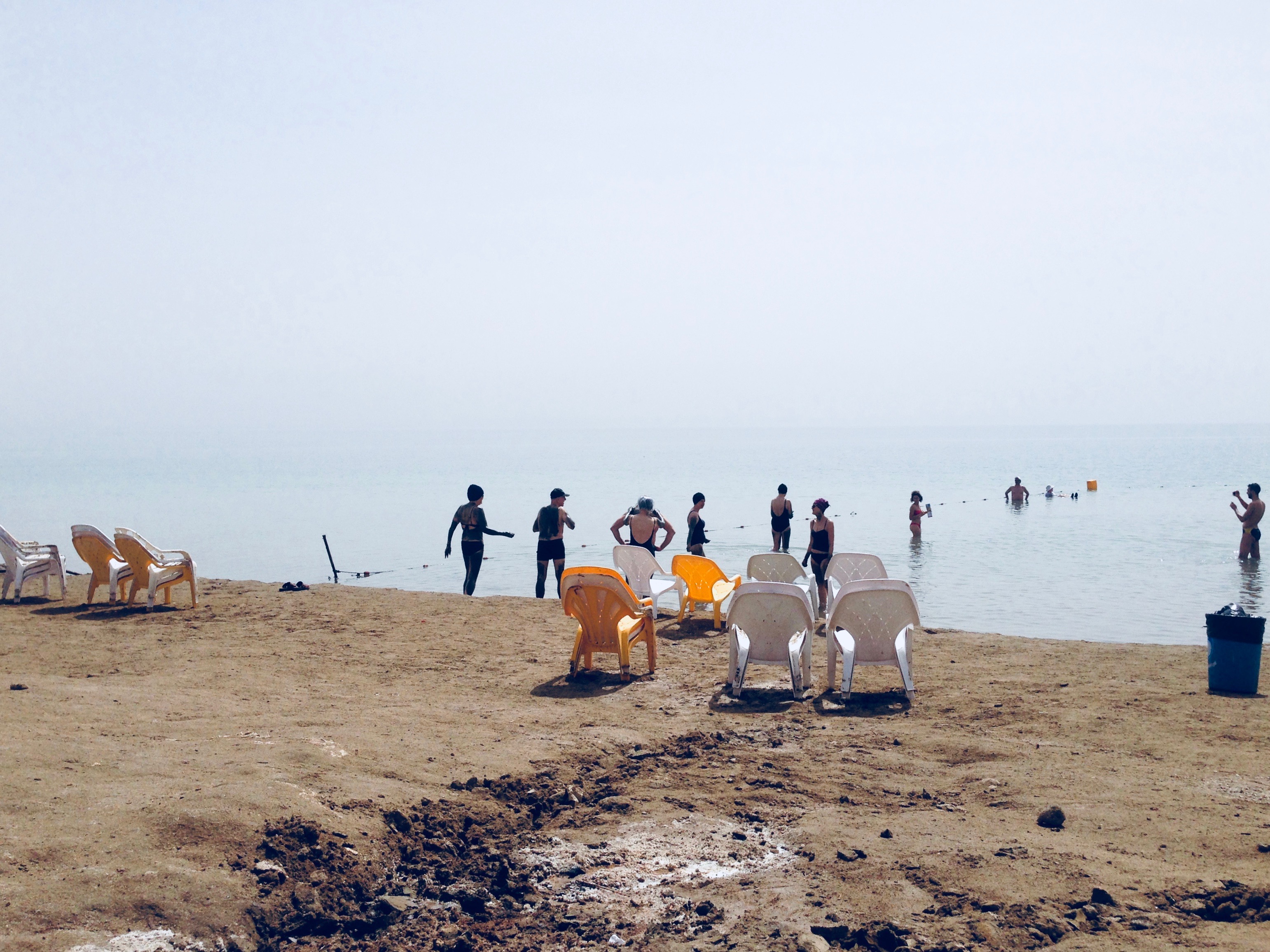 Unsere Neugier auf das Tote Meer war so groß, dass uns ernüchternde Berichte von Freunden nicht abhielten. Für den Ausflug haben wir uns für einen Tag ein kleines Auto gemietet. Am nördlichsten Teil des Toten Meeres wollten wir baden. Uns war nicht klar, dass an den gesicherten Badestellen ein hohes Eintrittsgeld (zwischen 20 und 30 Euro) verlangt wird. Wir bezahlten und wurden leider ebenso enttäuscht wie zuvor einige unserer Freunde: Die Badestelle war lieblos und klein. Ankommende Touristentouren überfüllten den Strand. Und trotz tagelangem Verzicht auf eine Rasur brannte mir das Salzwasser des Toten Meeres sehr auf der Haut. Da der faulige Geruch und die Palstikstühle am Strand nicht zum Verweilen einluden, fuhren wir an der Westküste weiter durch die Judäische Wüste Richtung Süden.