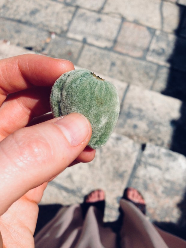Grüne Mandeln scheinen im Frühling ein saisonaler Verkaufsschlager zu sein. Wir bekamen eine geschenkt und probierten sie direkt. Da sie für uns nur unreif schmeckte, waren wir nicht sicher, ob sie wirklich so gegessen wird. Später las ich, dass die unreifen, grünen Früchte mit einer pelzigen Schale entweder mit etwas Salz und Zitrone roh geknabbert (also doch!), dünn gehobelt im Salat gegessen oder eingelegt werden. Wer grüne Mandeln probieren möchte, ist im Frühling in Israel genau richtig, denn bei uns sind die importierten Früchte eine teure Seltenheit.